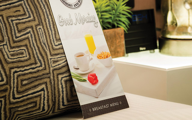 Go back to formFrom omelets, eggs benedict, and waffles to burgers, pasta, salad, steak, or salmon, our in-room dining services allow you to enjoy a private dinner or late-night snack in the comfort of your own guestroom. A perfect way to unwind after a long day on the beach or golf course. Call ext. 6390 to place your order. Please allow 30 minutes for delivery. State sales tax, 19% gratuity and a $2 delivery charge will be added to your bill for all room service orders.
