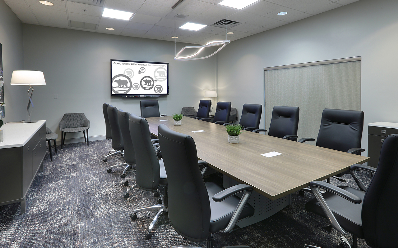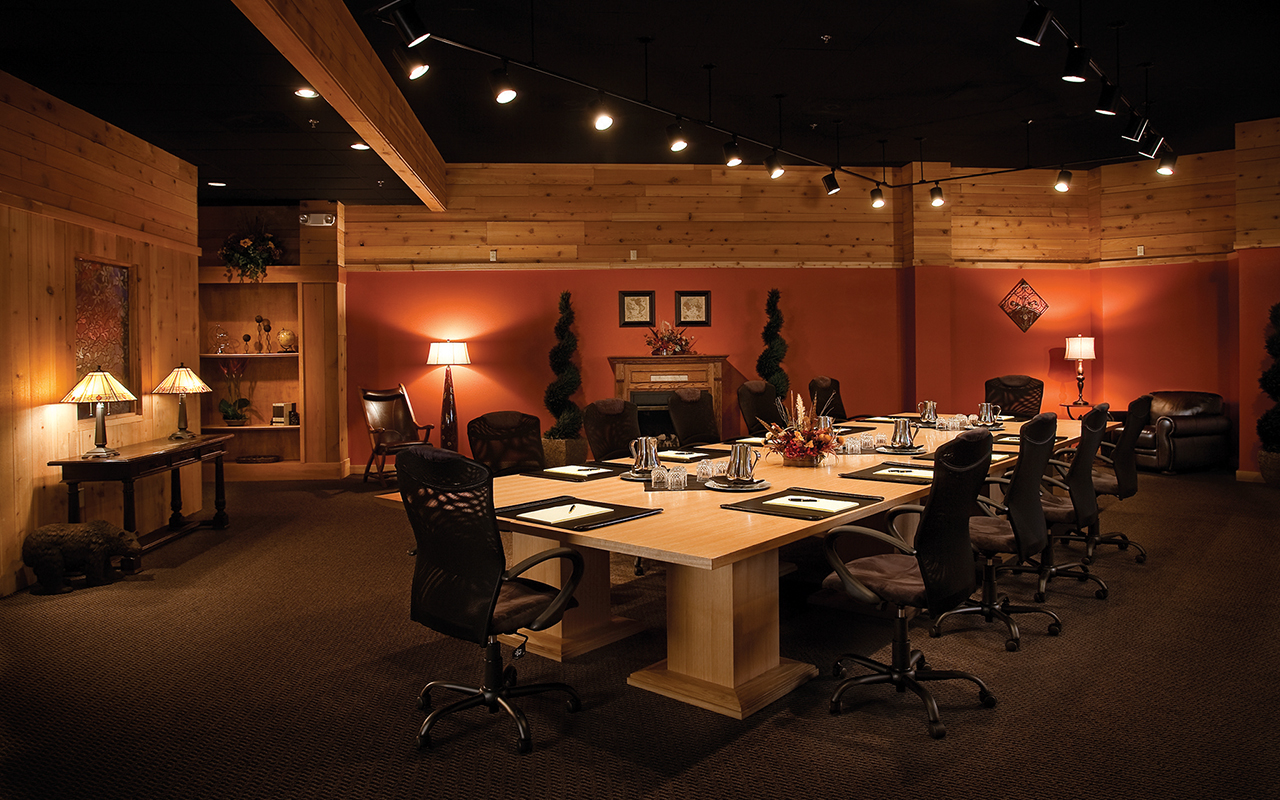 Have the classic “Up North” meeting experience in this boardroom accented with warm wood, high-end accents, and a cozy fireplace.